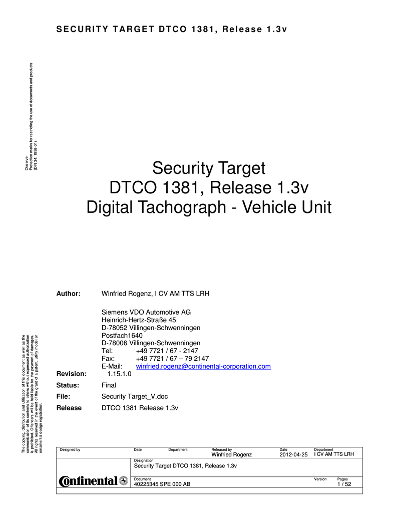 Bsi Dsz Itsec 0289 2005 For Digital Tachograph Dtco 1381