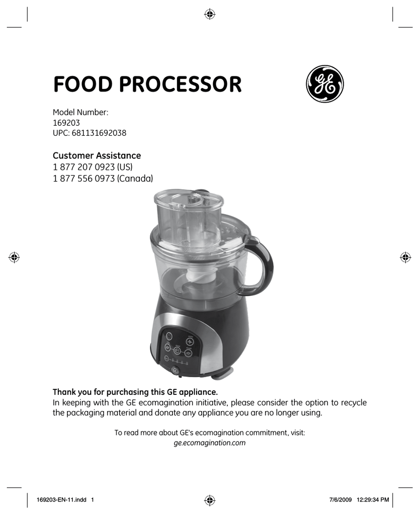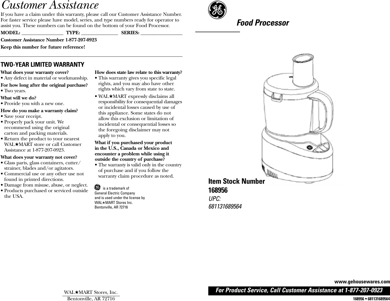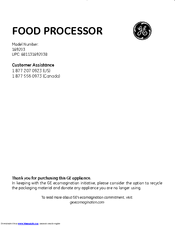 Customer Assistance Food Processor Ge 168956 User Manual Page